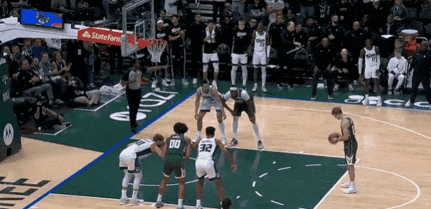 AJ-格林故意罚球不中,字母哥大鹏展翅抢到了前场篮板,奈何此时哨声响起,超时鸟……