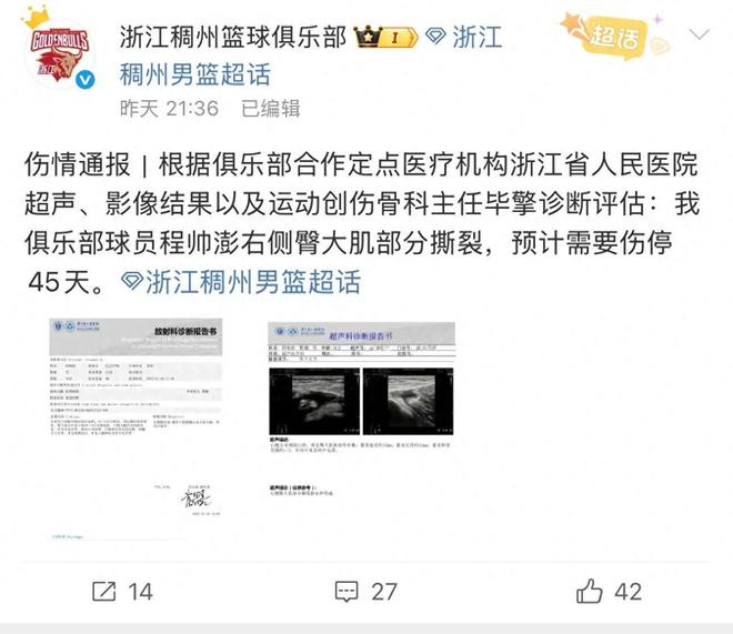 浙江男篮官方发文,程帅澎右侧臀大肌部分撕裂,预计需要伤停45天。