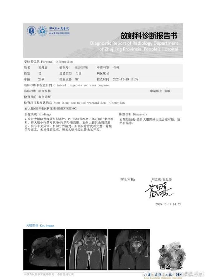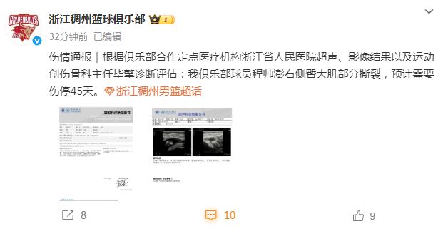 如今浙江男篮官方公告宣布:“伤情通报|根据俱乐部合作定点医疗机构浙江省人民医院超声、影像结果以及运动创伤骨科主任毕擎诊断评估:我俱乐部球员程帅澎右侧臀大肌部分撕裂,预计需要伤停45天。”